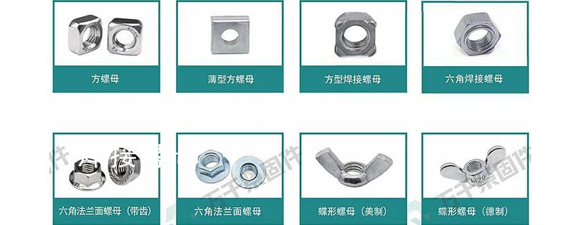 重型螺母、規格為DIN985-DIN982(厚型)的尼龍鎖緊螺母、規格為DIN1587的蓋型螺母、規格為GB6177/DIN6923的法蘭面螺母、規格為DIN6926的法蘭面螺母尼龍鎖緊螺母、規格為DIN928的四角焊接螺母、規格為DIN929的六角焊接螺母、 六角法蘭螺母、六角開槽螺母、尼龍鎖緊螺母、全金屬鎖緊螺母、壓點式鎖緊螺母、蝶形螺母、拉鉚螺母、壓鉚螺母、圓螺母、滾花螺母、T行螺母、卡式螺母、爪式螺母、焊接螺母、等標準緊固件以及非標緊固件;