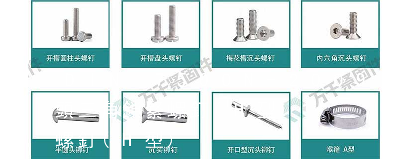 螺栓有:1、方頭螺栓,2、半圓頭方頸螺栓,3、十字槽盤頭螺釘,4、內六角沉頭螺釘,5、方螺母C級,6、蝶形螺母,7、六角頭螺栓,8、十字槽盤頭自攻螺釘。大小有M18、M6、M8、M16、M10、M12、M14、M20等型號。通常用 1、開槽圓頭木螺釘 GB 99-86 DIN96; 2、開槽沉頭木螺釘 GB 100-86 DIN97; 3、開槽半沉頭木螺釘 GB 101-86 DIN95; 4、六角頭木螺釘 GB 102-86 DIN571; 5、十字槽圓頭木螺釘 GB 950-86 DIN7996; 6、十字