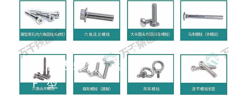 基本方法有兩種:外扳和內扳。一般而言,外扳擰的扭矩大于任何形式的內扳擰(內槽)。外扳擰:六角,六角法蘭面,六角凸緣,六角花形等;內扳擰:一字槽,十字槽H型,十字槽Z型,十字槽F型,四方槽,復合槽,內花鍵,內 沉頭內六角螺釘(平杯)、半圓頭內六角螺釘(圓杯)、十字槽盤頭機螺釘、十字槽沉頭機螺釘、十字槽大扁頭機螺釘、十字槽盤頭自攻釘、十字槽沉頭自攻釘、十字槽大扁頭自攻釘、全牙絲桿(牙條)、六角螺母、法蘭